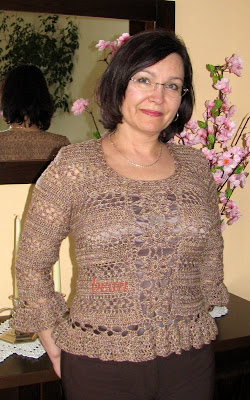 Bluzeczka bardzo mi się spodobała w oryginale, ale wiadomo, najczęściej pozują modelki, z którymi nijak mi się równać. A ponieważ ten model ma w dolnej części falbankę, to miałam obawy, czy aby za bardzo mnie tam nie poszerzy ;) Zrobiłam specjalnie troszkę krótszą, bo inaczej falbanka wypadłaby centralnie na biodrach. A tak chyba nie jest źle?!
