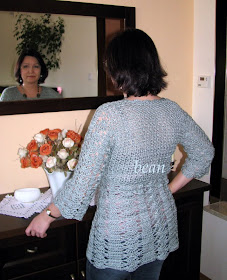 Bluzeczka bardzo mi się spodobała w oryginale, ale wiadomo, najczęściej pozują modelki, z którymi nijak mi się równać. A ponieważ ten model ma w dolnej części falbankę, to miałam obawy, czy aby za bardzo mnie tam nie poszerzy ;) Zrobiłam specjalnie troszkę krótszą, bo inaczej falbanka wypadłaby centralnie na biodrach. A tak chyba nie jest źle?!