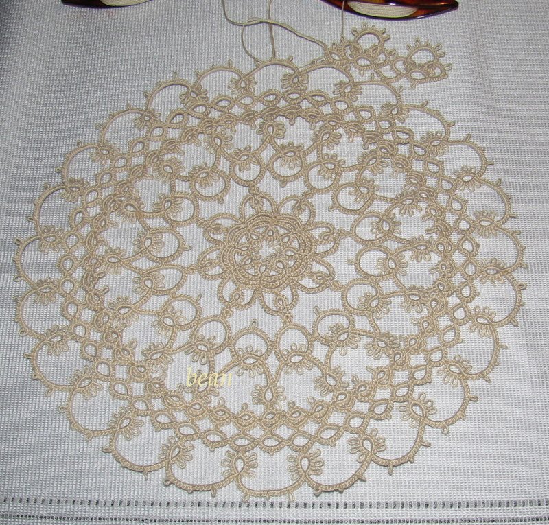 Frywolitkowa serwetka, choć jeszcze nieukończona, jest przecudna. Gratuluję umiejętności supłania!