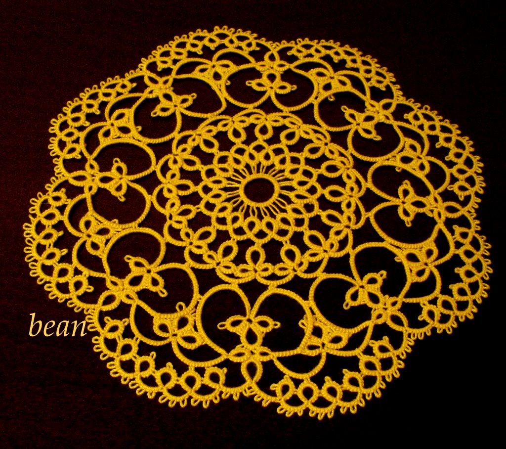 Frywolitkowa serwetka, a raczej serweteczka ;) bo jej średnica to zaledwie 14cm, powstała z żółciutkiego kordonka Altin Basak Klasik 50.
