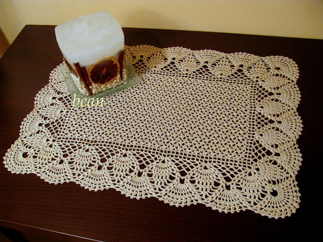 Szydełkowa jest dodatkiem do prezentu urodzinowego dla mojej Mamy i robiłam ją pod wymiar stolika. Wg schematu ananaskowa bordiura powinna być wykonana z podwójnych słupków, jednak musiałam troszkę wzór zmodyfikować gdyż serwetka wychodziła mi zbyt duża.