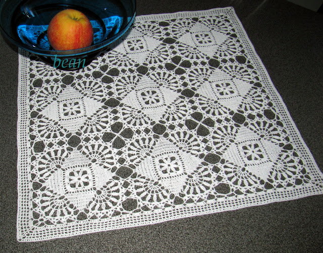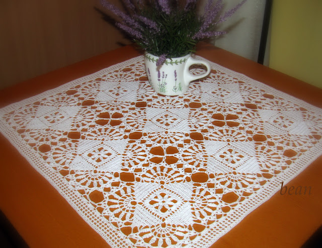 Moja serwetka nie jest zbyt duża, bo jest zrobiona tylko z dziewięciu elementów - rozmiar to 43 x 43 cm.
