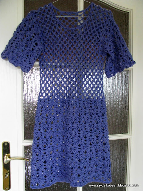 Z szafirkowej włóczki natomiast powstała tunika. Wzór rękawków i dołu okazał się być dosyć włóczkożerny - na tę dziurawą tunikę zużyłam w sumie 40dag (8 motków) Merino. Ta włóczka za to jest milusia i na pewno nikogo nie będzie podrażniać ;)