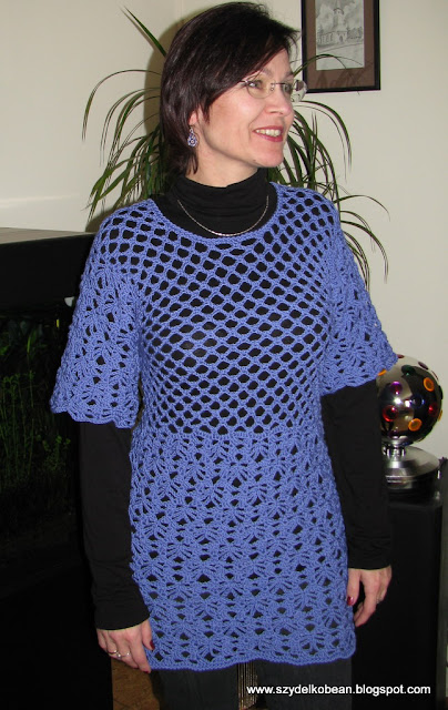 Z szafirkowej włóczki natomiast powstała tunika. Wzór rękawków i dołu okazał się być dosyć włóczkożerny - na tę dziurawą tunikę zużyłam w sumie 40dag (8 motków) Merino. Ta włóczka za to jest milusia i na pewno nikogo nie będzie podrażniać ;)