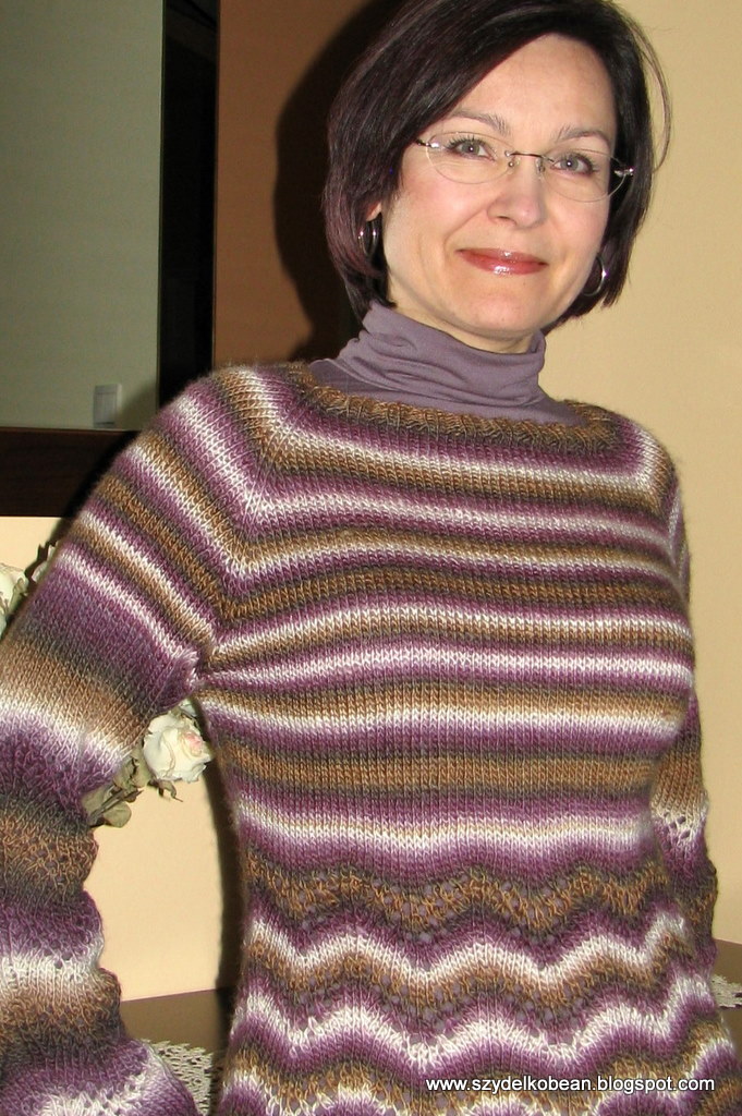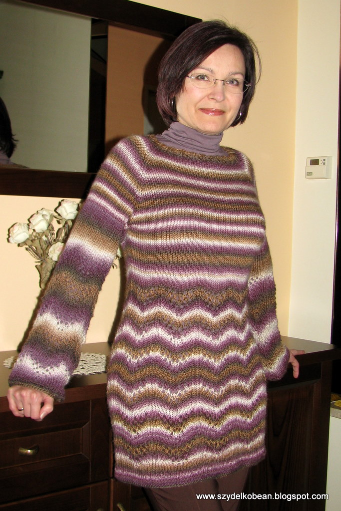 Przerabiana od góry, dlatego paseczki są węższe w górnej części tuniki a na rękawach szerokaśne.