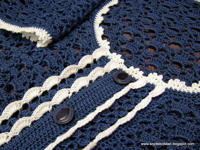 Swoją bluzeczkę robiłam bez rozpinania a guziczki dodałam dla dekoracji ;) Pliskę pod guziczkami wykonałam również szydełkiem, półsłupkami z narzutem.