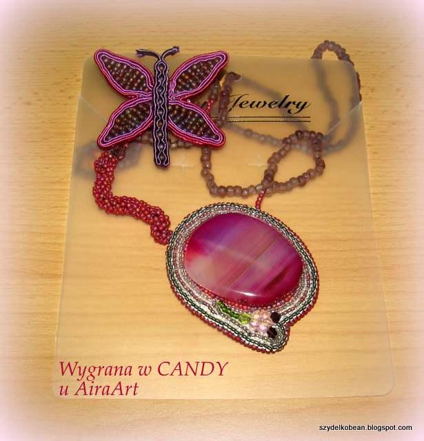 Jak widzicie, zapisałam się na różowe cudo :) Do pięknego naszyjnika dołączony był sutaszowy motyl - broszka.