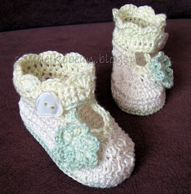 Buciki do kompletu z kordonka Perle5, wykończone bambusową włóczką melanżową, szydełko Apple 2mm