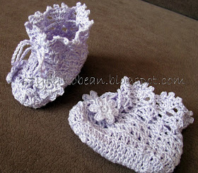 Buciki-skarpetki, wiązane w kostce, z lilowego kordonka Garden, szydełko Apple 2mm