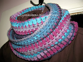 Bardzo spodobała mi się kolorystyka Grety Multi i z jednego moteczka szydełkiem 4 mm prostym wzorkiem "wyczarowałam" nieduży komin, który podwójnie złożony dosyć ściśle przylega do szyi.